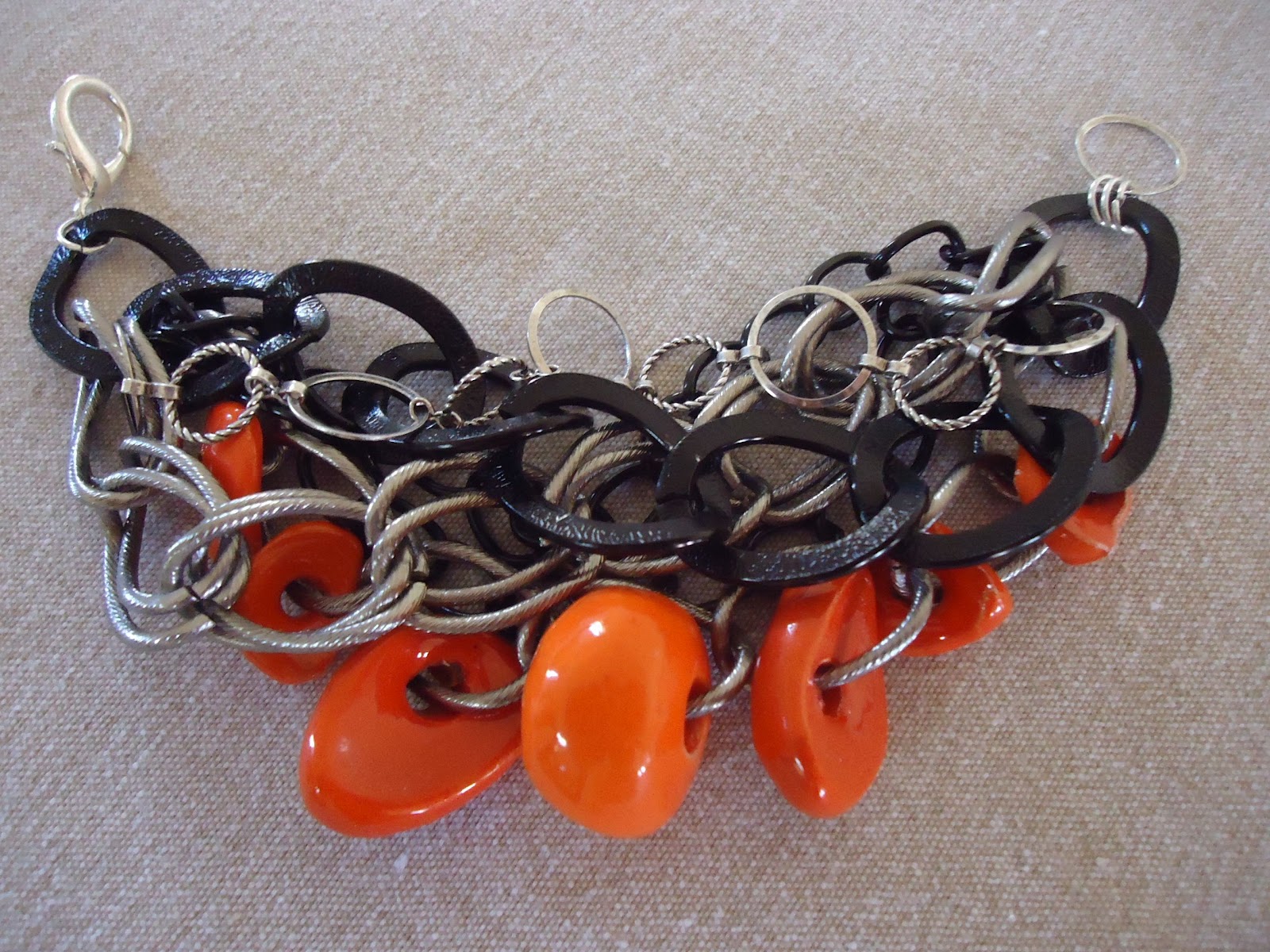 | Multi-strand silver and black chains with retro orange ceramic beaded strand. April, 2012. |
